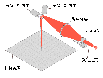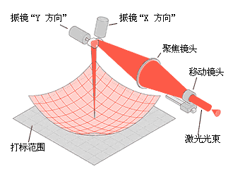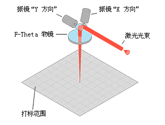 振镜扫描式打标头主要由XY扫描镜、场镜、振镜及计算机控制的打标软件等构成。根据激光波长的不同选用相应的光学元器件。相关的选件还包括激光扩束镜、激光器等。其工作原理是将激光束入射到两反射镜(扫描镜)上,用计算机控制反射镜的反射角度,这两个反射镜可分别沿X、Y轴扫描,从而达到激光束的偏转,使具有一定功率密度的激光聚焦点在打标材料上按所需的要求运动,从而在材料表面上留下永久的标记,聚焦的光斑可以是圆形或矩形,其原理如右图所示。在振镜扫描系统中,可以采用矢量图形及文字,这种方法采用了计算机中图形软件对图形的处理方式,具有作图效率高,图形精度好,无失真等特点,极大的提高了激光打标的质量和速度。同时振镜式打标也可采用点阵式打标方式,采用这种方式对于在线打标很适用,根据不同速度的生产线可以采用一个扫描振镜或两个扫描振镜,与前面所述的阵列式打标相比,可以标记更多的点阵信息,对于标记汉字字符具有更大的优势。